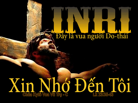 Khi Đức Giê-su bị đóng đinh trên thập giá, dân chúng thì đứng nhìn, còn các thủ lãnh thì buông lời cười nhạo: “Hắn đã cứu người khác, thì cứu lấy mình đi, nếu thật hắn là Đấng Ki-tô, của Thiên Chúa, là người được tuyển chọn!” Lính tráng cũng chế giễu Người. Chúng lại gần, đưa giấm cho Người uống và nói: “Nếu ông là vua dân Do-thái thì cứu lấy mình đi!” Phía trên đầu Người, có bản án viết: “Đây là vua người Do-thái.” Một trong hai tên gian phi bị treo trên thập giá cũng nhục mạ Người: “Ông không phải là Đấng Ki-tô sao? Hãy tự cứu mình đi, và cứu cả chúng tôi với!” Nhưng tên kia mắng nó: “Mày đang chịu chung một hình phạt, vậy mà cả Thiên Chúa, mày cũng không biết sợ! Chúng ta chịu như thế này là đích đáng, vì xứng với việc đã làm. Chứ ông này đâu có làm điều gì trái!” Rồi anh ta thưa với Đức Giê-su: “Ông Giê-su ơi, khi ông vào Nước của ông, xin nhớ đến tôi!” Và Người nói với anh ta: “Tôi bảo thật anh, hôm nay, anh sẽ được ở với tôi trên Thiên Đàng.”