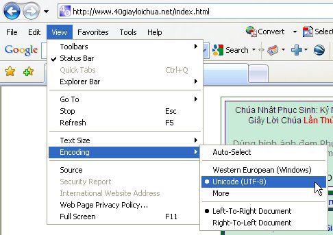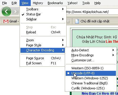 Nếu sử dụng Firefox: Vào View > Character Encoding và chọn Unicode UTF 8